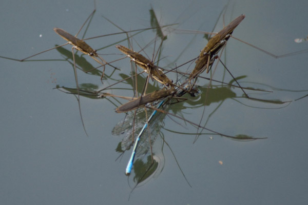水黾喜欢在水面上行动,虽然长得像蚊子,但却并不是害虫,它是一种益虫,可以说是水面“清洁工”。这是因为水黾主要是以掉落在水上的其他昆虫、虫尸或其他动物的碎片等物为食。水黾就像蜘蛛捕猎一样,都是传感性能极强的捕食者,只不过蜘蛛依靠的是蜘蛛网,而水黾则是依靠在水面上的脚,水黾的脚能够从水面上感受到细微的变化,当有细微的弟兄掉落在水面,产生很细小的震动,水黾就会像箭一样的飞奔过去。