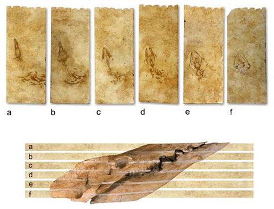 化石发现于2003年,鲸的头骨和躯干上部骨骼保存在灰岩石材中,石材来自于埃及的采石场,六块切割好的石板能清楚看到史前鲸化石的轮廓。随后它们被送往比萨大学自然历史博物馆进行展出,以便更好的科学研究和向大众展现它的魅力,Bianucci也决定重新还原这具鲸化石原来的面貌。