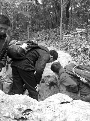 这次到栖霞山,除了南京地质古生物研究所的研究生、博士生外,还有南京大学以及从外地赶来的研究生、博士生们。进了栖霞山的铁门,他们就掏出了工具,在明镜湖旁停下。这是一段山底的石头,灰色,有的岩石还带点黑色。这种岩石就叫本部灰岩,岩石中有很多化石,“单体动物、复体动物,还有不知名的化石。”