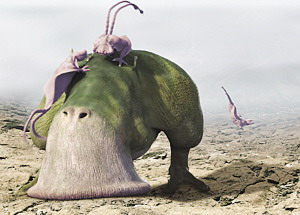 吃草的嘴像吸尘器, 霍金设想的肉食草食动物大战发生在垂直的峭壁上,食草兽利用吸尘器般的大嘴牢牢固定在峭壁上。
