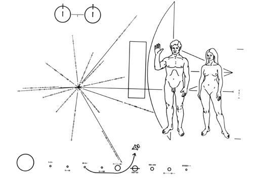 1972年至1973年,美国宇航局先后发射“先驱者10号”和“先驱者11号”行星探测器,这两个探测器分别都携带了本图所显示的图案。本图被刻画在一张15X23厘米大小的铝盘上,目的是为了告诉所有可能遇到的外星人,本飞船何时从何地发射,以及地球在宇宙中的位置。图上有一个男人和一个女人的画像,这可能会是外星人最难理解的。“先驱者10号”是人类建造的第一个成功飞越太阳系的飞行器,在人类探索宇宙的过程中,它将注定会比其它任何探测器更有资格树一座丰碑。隔着大约119亿公里,美国宇航局的科学家日前再次成功地与“先驱者10号”取得通信联系。科学家们说,这次超远距离的长途通话效果不错,证明这颗漂泊在太阳系外的探测器依然正常运转。科学家利用位于美国加利福尼亚州的一个射电望远镜,向“先驱者10号”发去了信号。经过22小时零6分钟,美国宇航局喷气推进实验室设在西班牙马德里的一台射电望远镜,收到了来自“先驱者10号”的回应。